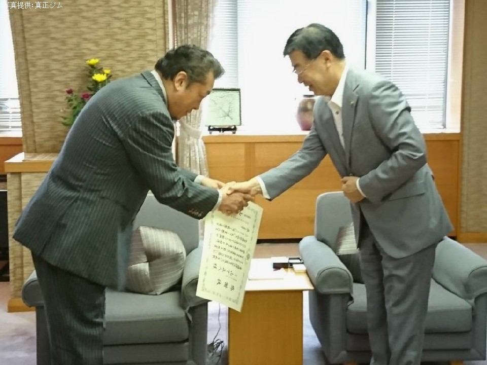 真正ジムの山下正人会長が27日、京都府庁で山田啓二知事より感謝状が贈られた。この感謝状は9月3日、島津アリーナ京都(京都府立体育館)において真正ジムが主催した「THE REAL FIGHT」で東日本大震災の被災者と京都府内の青少年を招待し、京都府内のスポーツ振興に寄与したものを表彰したもの。