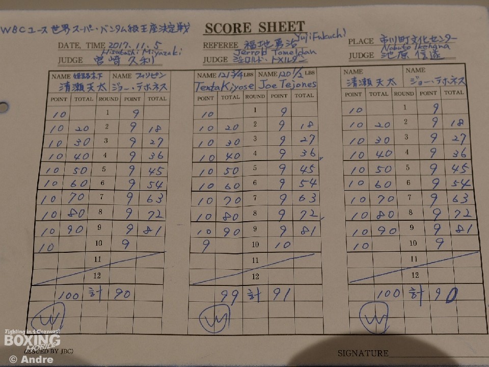 試合は、清瀬がジャブから左ボディを決め序盤からペースを握った。テホネスはガードを固め前に出ると左ボディから右ストレートを伸ばし応戦した。4ラウンド終了時点での途中採点は3者ともフルマークで清瀬を支持。中盤、清瀬のボディでテホネスの動きが鈍るが決め切るチャンスを逃す。8ラウンド終了時点での途中採点でもフルマークで清瀬が有利を保った。最終ラウンドまで、タフなテホネスを攻めあぐねた清瀬だが、大差判定で初のタイトルを手にした。