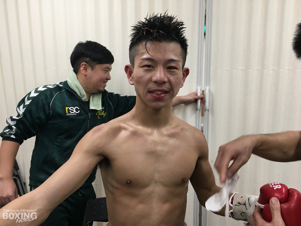 「しょっぱい試合をしてしまった」と控え室で苦笑いしたのはチャンピオン。「うまくボクシングをする予定だったが、相手に付き合ってしまった。一発にこだわって、一発で距離を詰める展開になった」と試合を振り返った。それでも、「体のスタミナとパワーは勝てた。少し距離が遠かったが、最後まで押し切れた。後半まで戦ったので勉強になった」と笑顔で会見を終えた。
