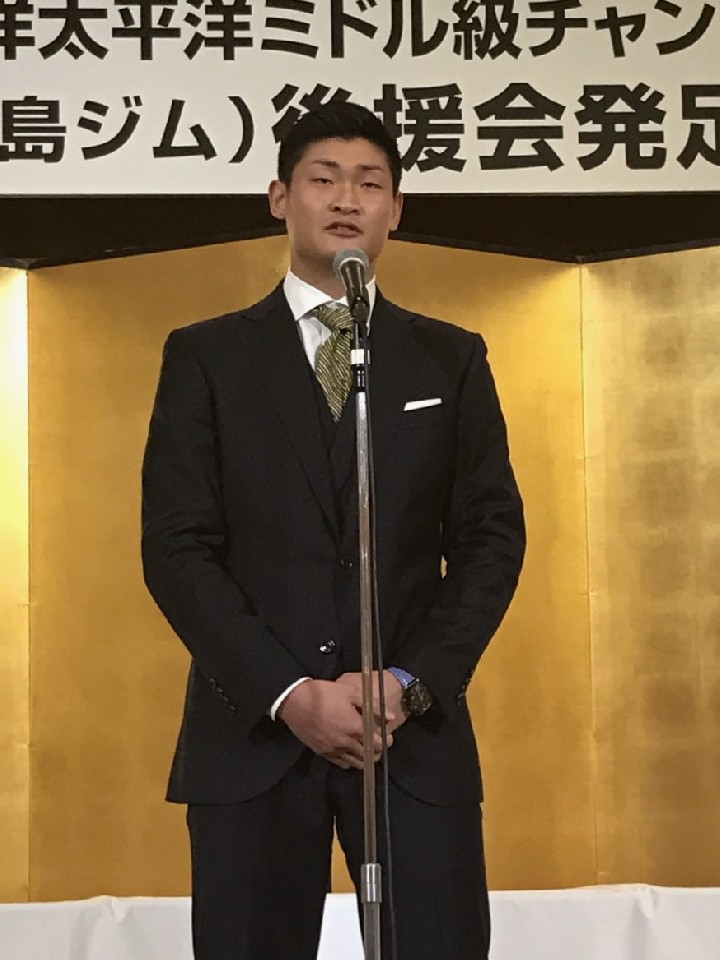 東洋太平洋ミドル級チャンピオンで12月3日(日)に3度目の防衛戦とWBOアジアパシフィック同級王座決定戦に臨む太尊康輝(六島ジム所属)が19日、帝国ホテル大阪で開かれた自身の後援会発足パーティーに出席、100名を超す支援者に祝福された。2012年4月にプロデビューしたサウスポーの太尊は190cmの長身を生かして勝ち星を重ね、昨年の11月23日に初戴冠した。戦績は17戦13勝(11KO)2敗(2KO)2分。中量級の選手らしく、高いKO決着率を誇っている。「必ず世界チャンピオンになる」と力強く語った24歳が注目を集めている。