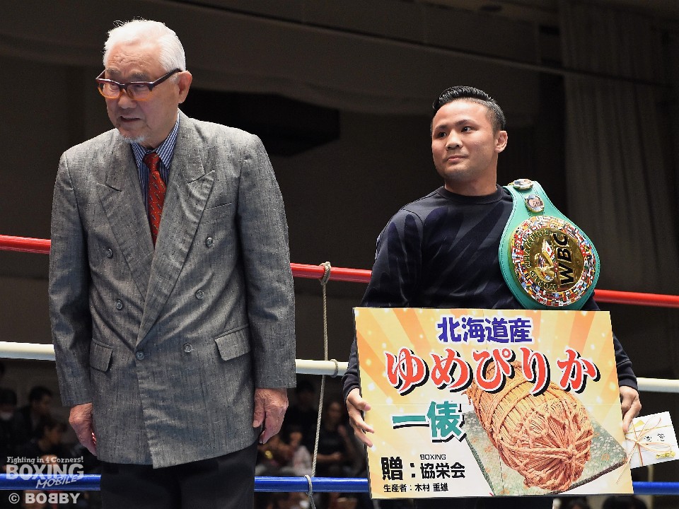 また、一門の白井・具志堅スポーツジム所属で5月にWBC(世界ボクシング評議会)フライ級王座を獲得、先月22日には初防衛に成功した比嘉大吾(22)に、先代の故・金平正紀会長とともにジムを支えた協栄会名誉顧問の黒木氏より、金一封と副賞の米一俵が贈呈された。