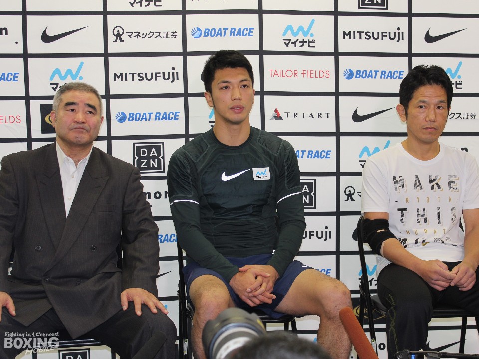 会見の冒頭、浜田剛史帝拳プロモーション代表は「前回の試合は皆さまの応援のおかげで、プラスアルファの力を出せて勝つことができた。今日から初防衛戦に向けて練習を再開していく。次戦は来年の4月頃、日本で予定している。チャンピオンになり孤独感を感じるかもしれないが、自分で乗り切るしかない。まだ時間があるので対応力を磨きながら色々なことを試してほしい」とコメント。