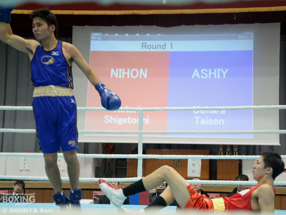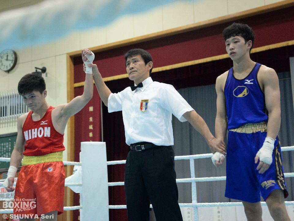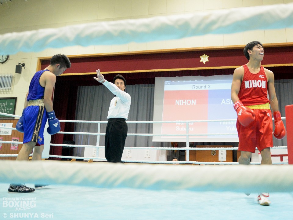 バンタム級1で日大は全日本選手権に「肉体改造」を理由に予選から出場しなかった村田昴(日)を起用。関西の最優秀選手である山内祐季(芦・主将)に3回、クリーンヒットの連発で2度のカウントを奪ってRSC勝ちとなった。