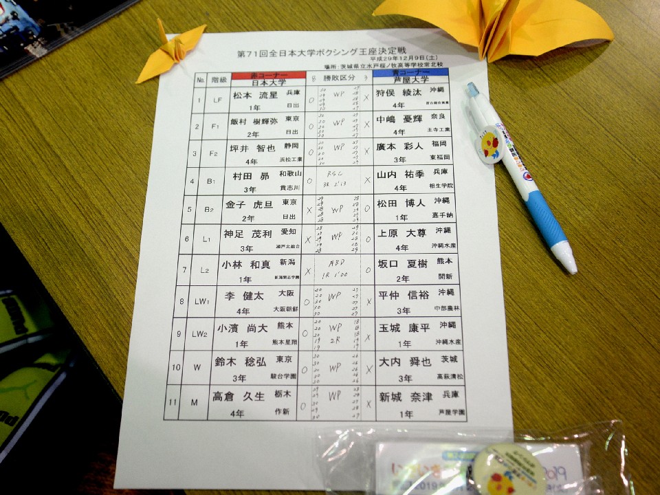 茨城県立水戸桜ノ牧高校常北校では、9日、第71回全日本大学王座決定戦では、関東大学リーグ優勝の日本大学が関西学生リーグ優勝の芦屋大学を破り、4年連続の大学日本一に輝いた。また、この大会の最優秀選手賞は李健太(日本大)、敢闘賞は松田博人(芦屋大)、技能賞は村田昴(日本代)の手に渡っている。これで今年のアマチュアボクシング界では、全国大会は13日から鳥取・米子で予定されている女子&社会人選手権のみとなった。
