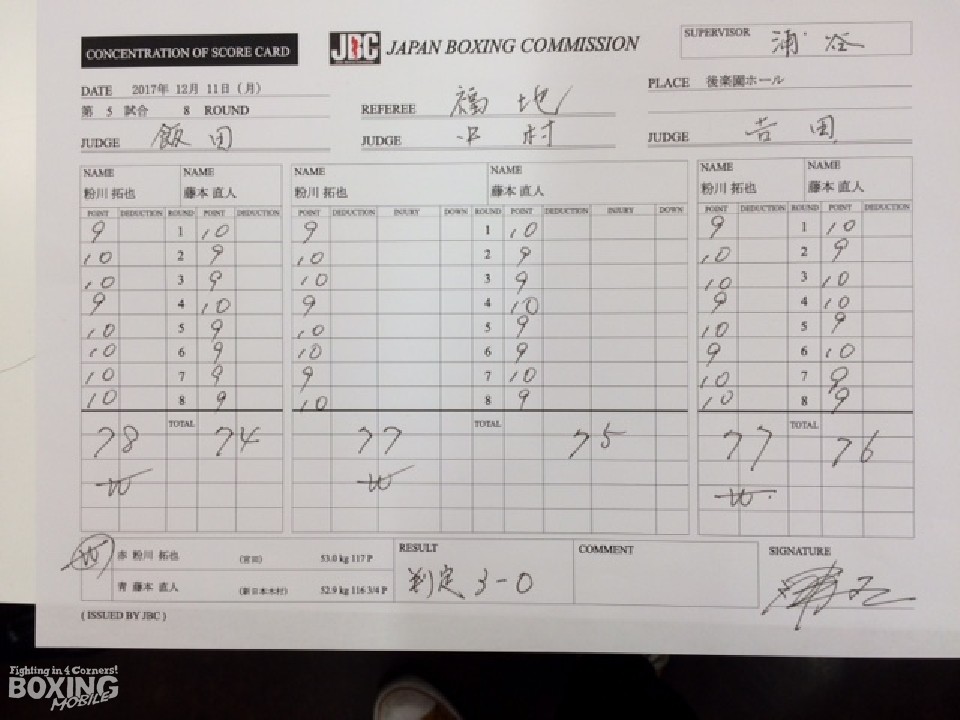 初回、藤本がワンツーをヒットすると格上の粉川に臆することなく攻め立てた。対する粉川は2回になると、ジャブからスピードを活かした攻撃で反撃すると、右を合わせてペースを奪った。藤本はワンツーを軸に流れを取り戻そうとしたが、粉川はサイドに動いては細かい連打を浴びせてポイントを加点。しかし、ランキング奪取に闘志を燃やす藤本も懸命に手数を出し応戦した。採点は1〜4ポイント差で粉川を支持した。