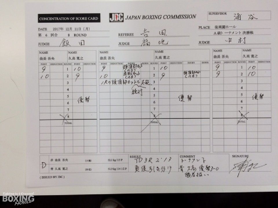 完全決着とはならなかったが、挑戦権を得た久高は「本当に申し訳ないです。ボディを打ったら嫌がっていたのがわかったので3回から馬力を上げようと思ったが…。前向きに捉えたら良いがスッキリ勝ちたかった」と悔しさを滲ませた。船井のベルトに挑戦する久高は「今回の試合は良いコンディションを作れたので切り替えて挑みたい」と約11年ぶり2度目の日本タイトル戦に向けて気持ちを奮い立たせた。