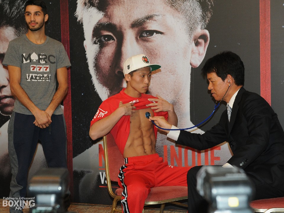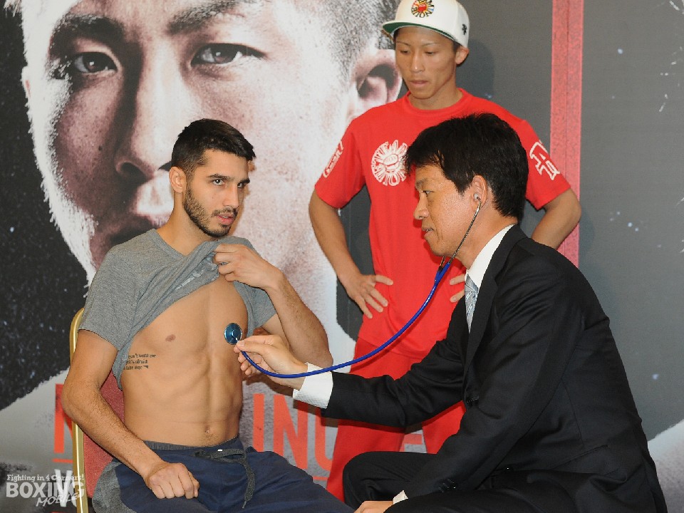 一方、来日が遅れていたマネジャー、トレーナーとこの日に合流する予定のボワイヨは、美人妻のバネッサ夫人と姿を現し、日本独特のメディカルチェックを楽しむ余裕を見せた。初めて対面した井上の印象を聞かれ「特に印象はない。パワーがあるようには感じかった」と返したボワイヨは視力が左0.4、右0.2と悪く、「5歳の頃から近視だった」と説明。それでも「相手の細かい顔を見るわけじゃないから大丈夫」と笑い、夫人と手を繋いで会場を後にした。明日は同ホテルで調印式が行われる。