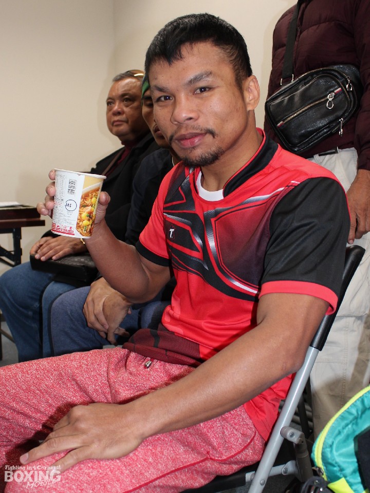 一方、これが初来日となるマガレは300gアンダーの58.6kgで秤を降りた。現在、フィリピンの首都マニラの気温は29℃。日本は寒いと話したマガレは「タイトルを守るために一生懸命にトレーニングしてきた。KOでも判定でもしっかり勝つ」と拳を握った。