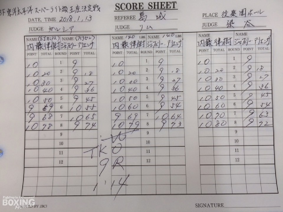 サウスポー同士の一戦は初回から内藤がジャブから左カウンターを決めてペースを掌握。アリエンザの攻撃もサイドに回り、ボディを叩いて体力を削った。4ラウンド終了時の公開採点をフルマークでリードすると、上下にコンビネーションを決めてダメージを与えた。しぶとく食い下がったアリエンザだったが、内藤が攻勢を続けるとレフェリーが試合をストップした。
