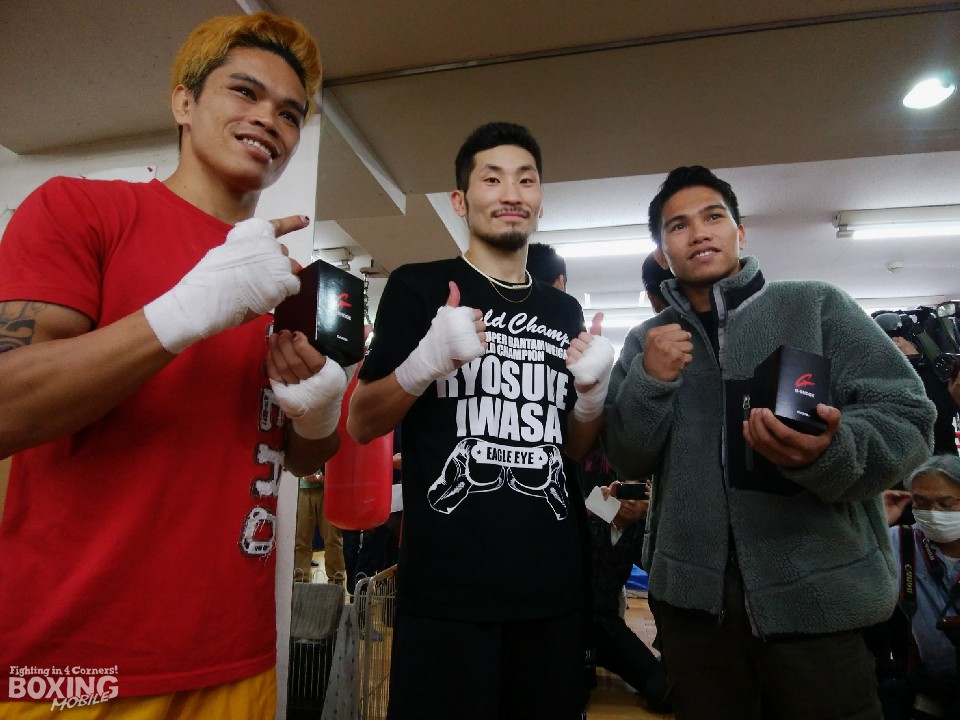 体重は残り2kgを切り、仕上がりは順調そのもの。実戦練習もこの日で終了となり、来週の月曜から都内のホテルに入り、試合前日までの3日間は完全休養を取る。苦手と話していたフィリピン人との対戦も、今回は同じ国のWBOアジアパシフィック・バンタム級13位ケニー・デメシリョ(25)、比国フェザー級7位のベルゲル・プトン(28)を呼び寄せ、対策を練ってきただけに自信が深まった。スハ゜ー打ち上げ後、岩佐は感謝のしるしとして二人にGショックをプレゼント。ここでも固い絆が結ばれた。