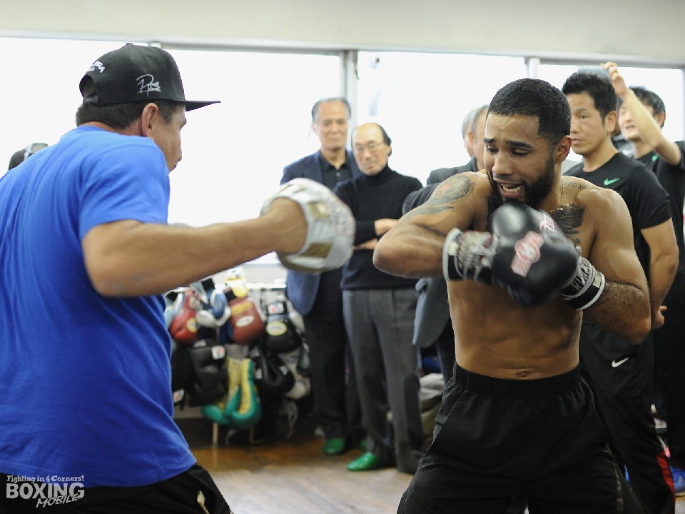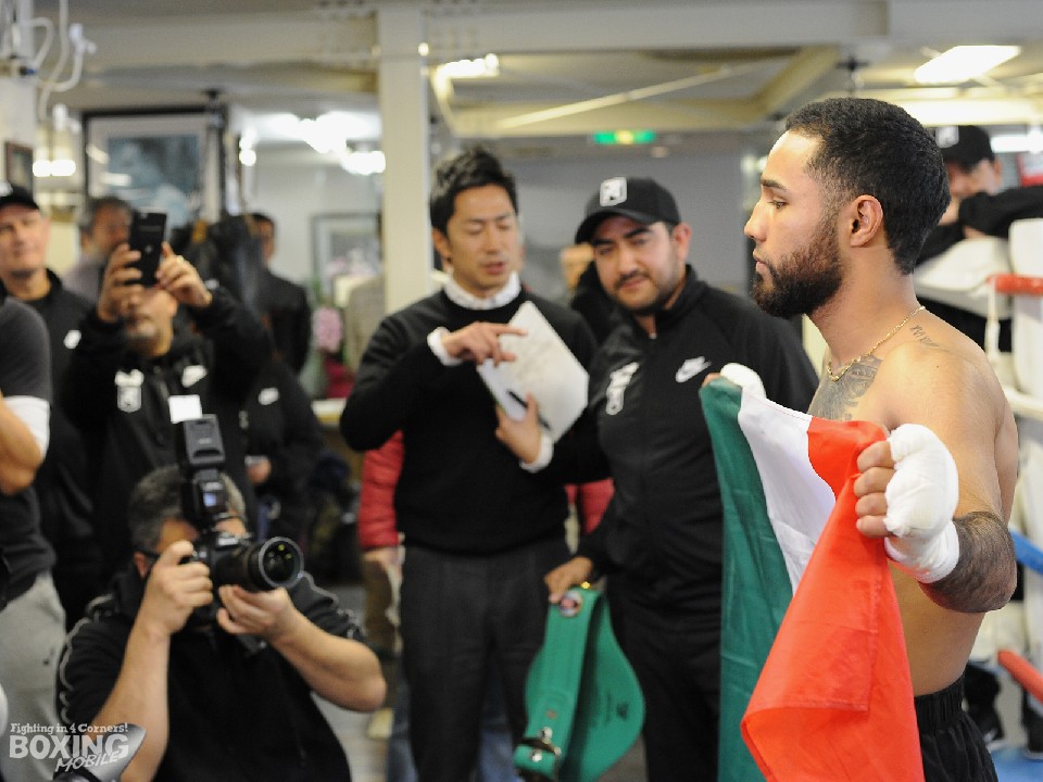 練習ではチームスタッフが気分を盛り上げ、リラックスしたなかでシャドー、ミット打ち、サンドバッグなど12ラウンドを消化。リミットまで残り4kgのネリはたっぷりと汗を流し、ラミレス氏とのミット打ちでは山中を沈めた左アッパー、右フックの凄まじい連打を披露し、健在ぶりをアピールした。練習を視察した田中繊大トレーナーは「前回と同じくパンチの回転があってしかも速い。連打も出ていてパワーも感じる」と警戒していた。