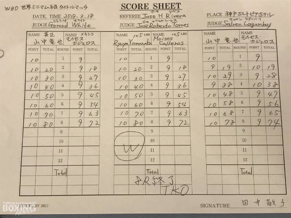 初防衛戦とは思えぬ貫禄のボクシングを展開した山中がリングの上で、存在感を見せつけた。チャレンジャーの出鼻をくじくジャブと右ストレート、アッパーも好打した。試合が決定的となったのは8ラウンド。ロープに追い込むと連打で相手の心を折った。9ラウンド開始のゴングを待たずに青コーナーから棄権の合図が出ると会場は大歓声に包まれた。
