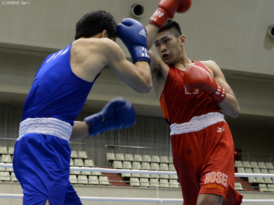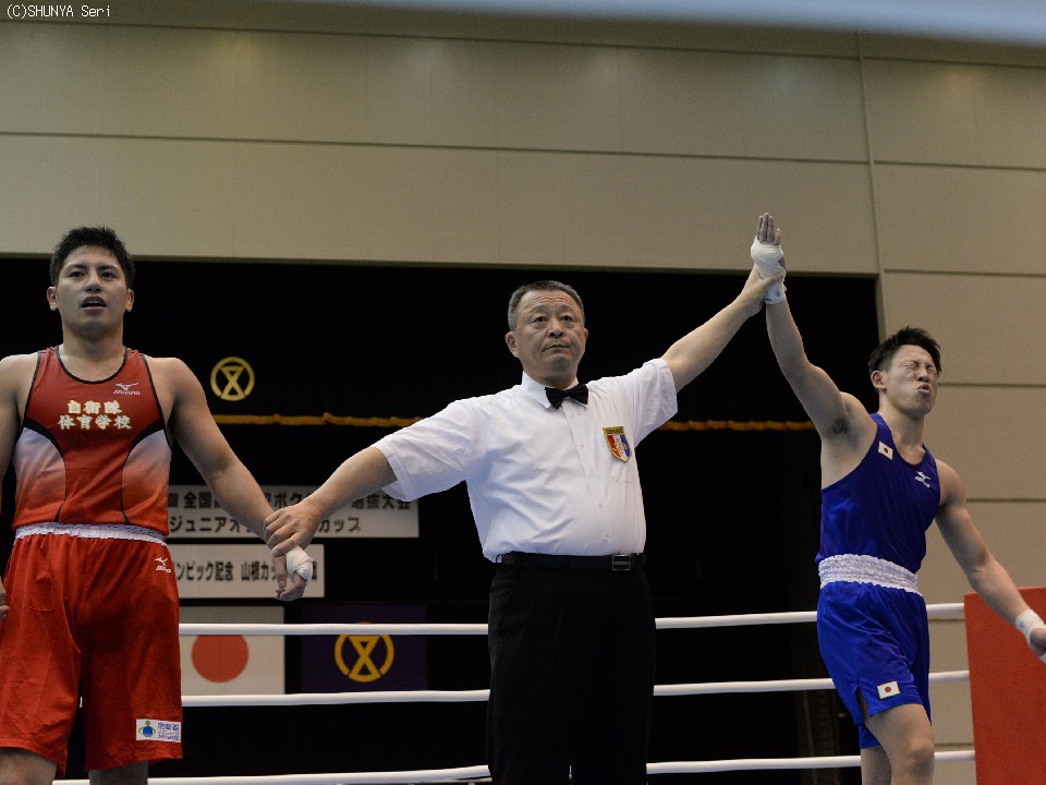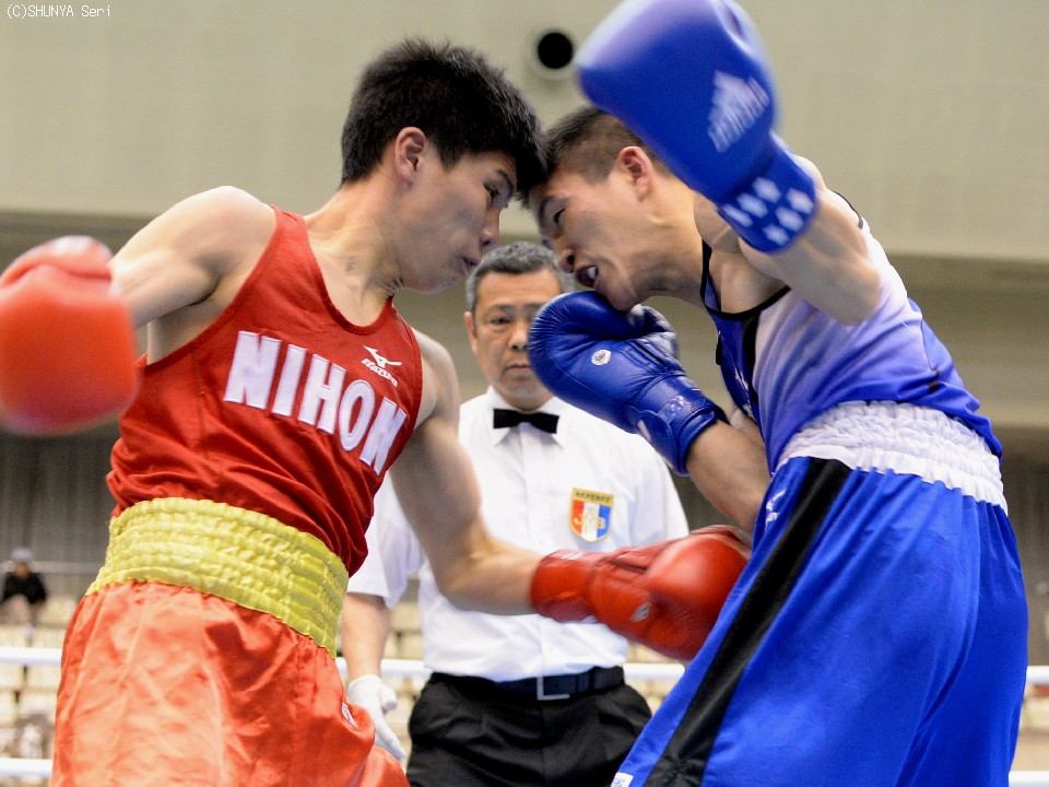 国内トップ選手同士が拳を交えていく中、ライトフライ級・坪井智也(日本大)、フライ級・馬場龍成(東洋大)、バンタム級・堤駿斗(習志野高)、ライト級・森坂嵐(東京農業大)、ライトウェルター級・成松大介(自衛隊体育学校)と赤コーナーから登場した「王者」たちが勝者コールを受ける連続となる。「挑戦者」勢が一矢報いた試合が6つ目のウェルター級戦だった。