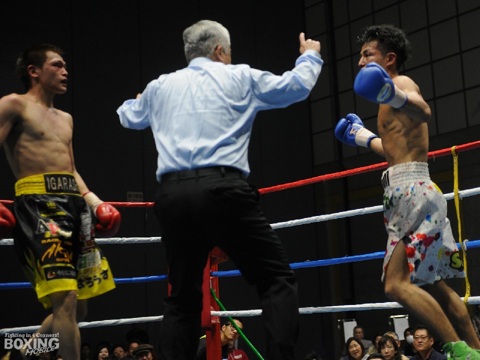 押され気の五十嵐も中盤からペースを上げ、左ボディからのコンビネーションで本吉を苦しめ、最終8回には右のカウンターを決めダウンを奪った。片膝がキャンバスに付いてしまった本吉はダメージなく立ち上がるがここで終了のゴング。善戦していただけに悔やまれるダウンだった。