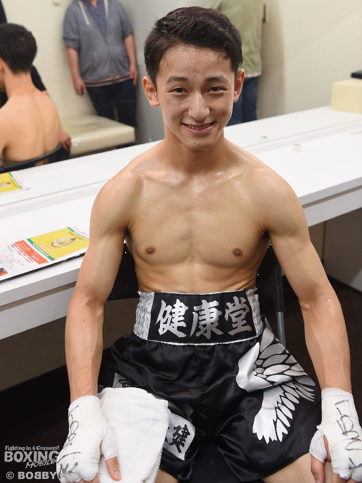 控室に戻ると、ジムの先輩で日本ミドル級王者の竹迫司登(たけさこ・かずと)に祝福された森は、「相手の動きを見てから左から攻めようと思っていた。倒したのはたまたま」と謙遜した。