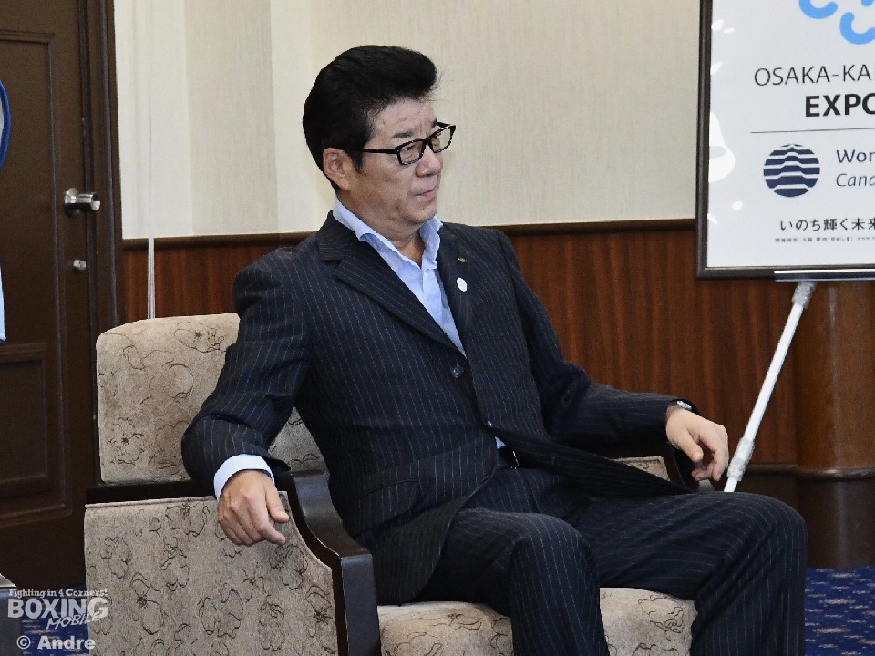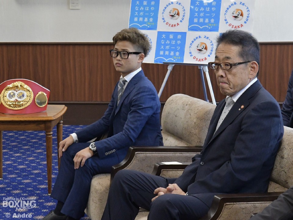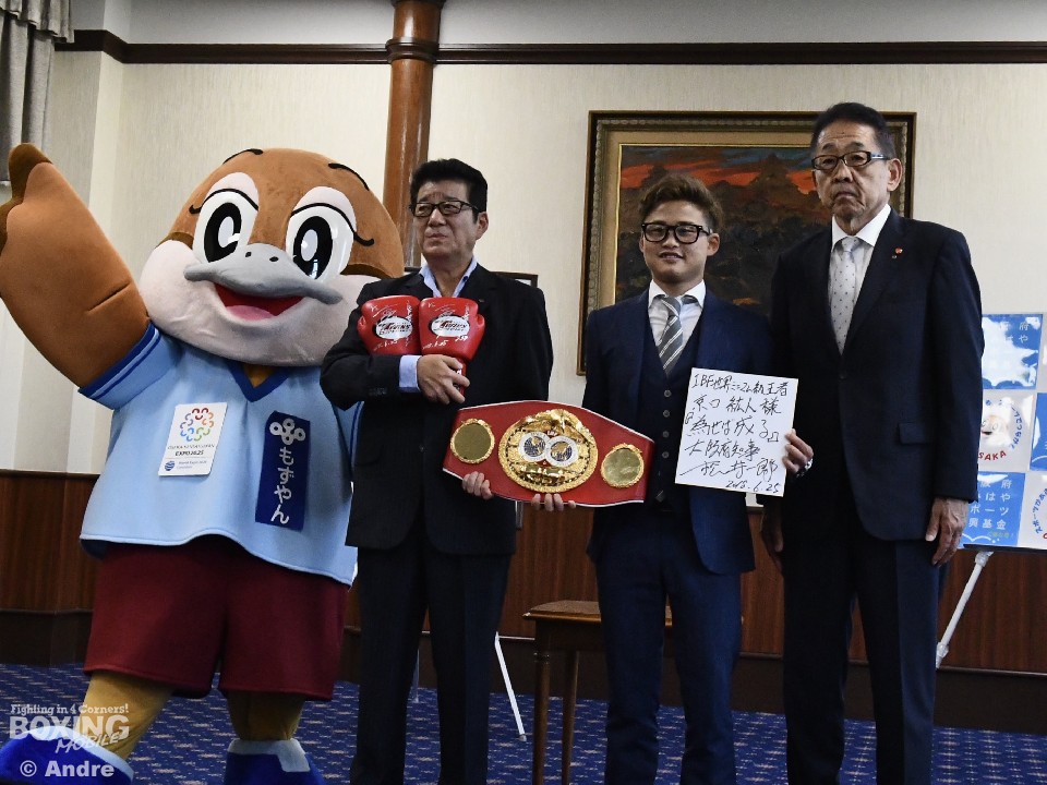 IBF世界ミニマム級チャンピオンの京口紘人(ワタナベ)が25日、出身地の大阪府・松井一郎知事を表敬訪問した。京口は、先月20日に大田区総合体育館で開催された2度目の防衛戦で判定勝利したことを報告し、さらに、18日に起こった大阪北部地震のお見舞いと寄付金(50万円)を松井知事に手渡した。