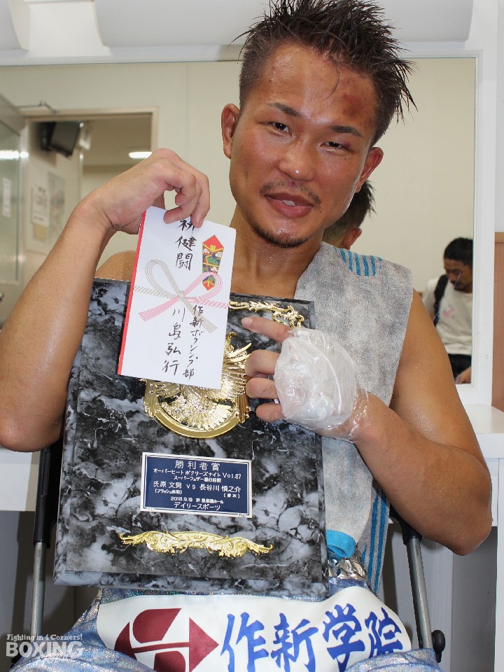 控室に戻った長谷川は「タフな相手だったけど勝つことができて良かった」と安堵の表情。アマ時代はボクシングの名門、作新学院から駒沢大学と進んだが、大学時代は補欠で「雑草以下でした。あまり良い思い出がないです」と長谷川。卒業後は競技から一度離れたが、職場から近い青木ジムに入門するとボクシングへの情熱が再燃しプロのリングに上がった。