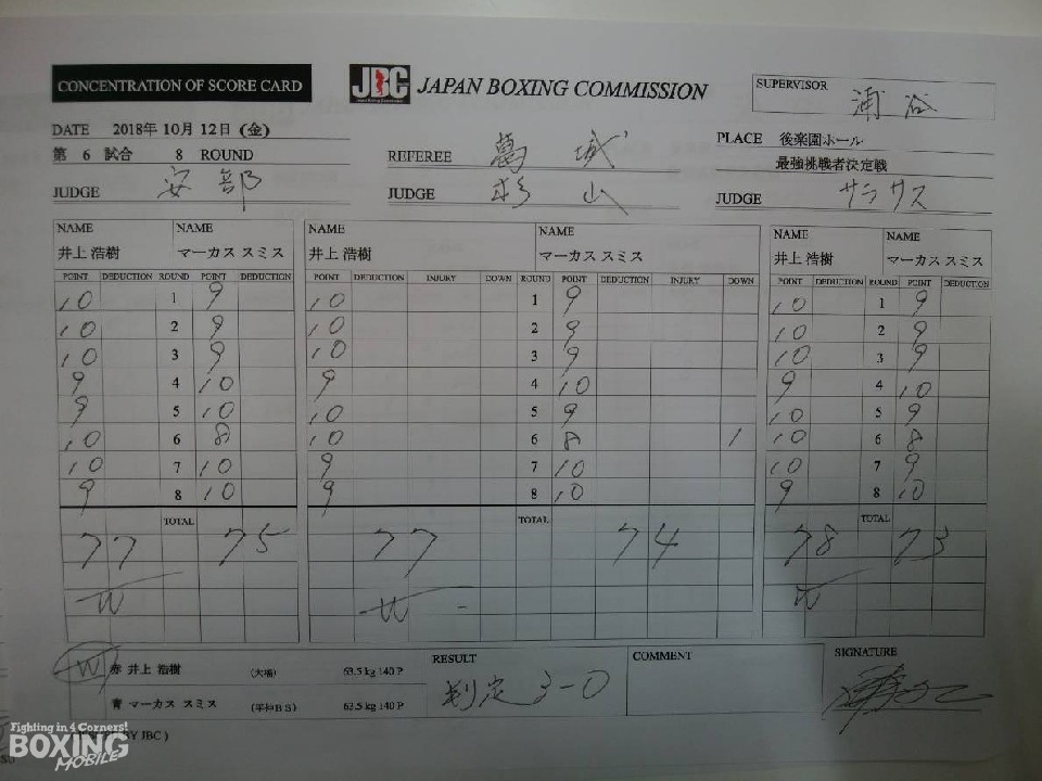 序盤から駆け引きしながら相手の出方を伺う展開でスタート。井上が単発の左ストレート、右フックを放つのに対し、スミスは飛び込んでのボディ攻撃で反撃。互いに決定打が生まれなかったが、6回に井上は左ストレートで痛烈なダウンをゲット。ここを何とか立ち上がったスミスは最後まで攻め、試合終了のゴングを聞いた。