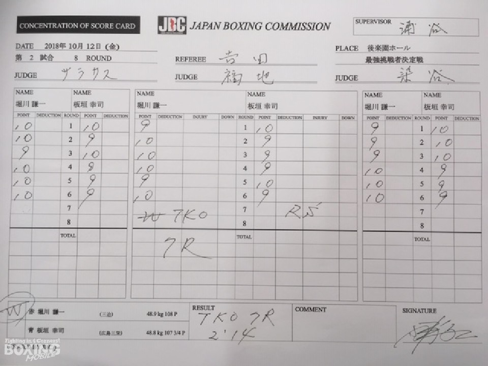 試合巧者ぶりを発揮した堀川は、「最後は右のスィングが相当効いていたのでまとめて決めた。距離に関しては、無理に行かないということを加藤トレーナーと試合前に話していてプラン通りにできた」。 「板垣選手はパンチを外すのが上手く、なかなか当てさせてもらえなかった。前回は判定だったのでTKO勝ちはうれしい」と試合を振り返った。