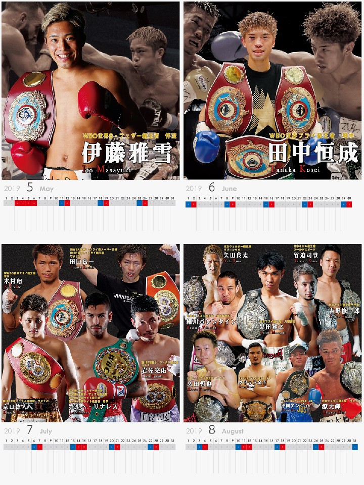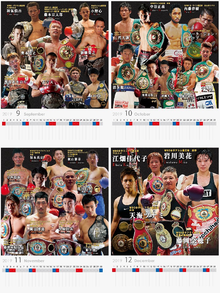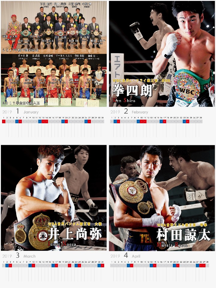 日本プロボクシング協会製作の2019年度版カレンダーがこのほど完成し、11月4日から販売開始となる。今回は現役世界王者を大きくクローズアップしたほか、地域王者、日本王者、女子世界王者に加え、WBCユースと日本ユースチャンピオン、そして記憶に新しい前世界王者を掲載。デザインに趣向を凝らしたものとなっている。