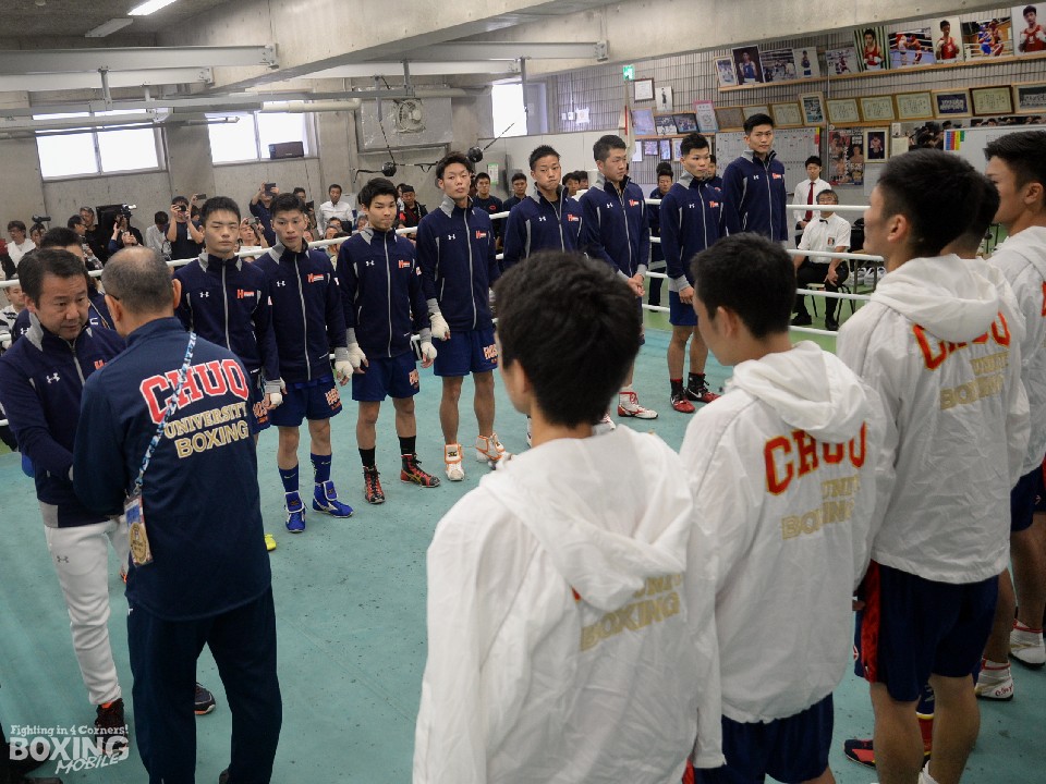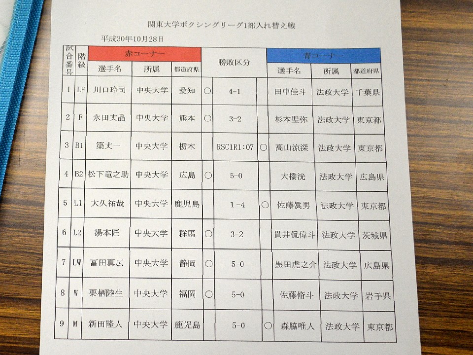 昨日、東京・世田谷区にある駒澤大学・玉川キャンパスでは、7月21日に急遽中止となった関東大学ボクシングリーグ入替戦の中央大学(1部最下位)と法政大学(2部優勝)が行われ、会場にはかつて法大で活躍したワールドスポーツジムの斎田竜也会長や井上岳志を含めた両校OBやボクシングファンが多く訪れ、その中で激闘が繰り広げられた。なお、下部ですでに行われた入替戦では茨城大学が4部、青山学院大学が3部、専修大学が2部への昇格を決めている。結果は動画か「続き」にて。