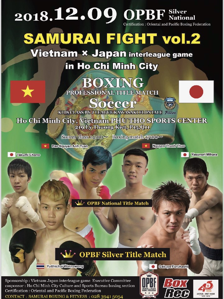 この大会は「両国選手たちによるボクシングを通じた日越親善・交流」と、「ベトナムにおけるプロボクシングの普及・発展」をテーマとし、ベトナム初の公式タイトルマッチとして、日本Sバンタム級11位の古橋岳也(川崎新田)とユッティチャイ・ワンナウオン(タイ)が空位のOPBF東洋太平洋シルバー王座を争うほか、昨年日本でプロデビューを果たしたダオ・グエン・アン・トン(タイ)が初の国内王座「OPBFナショナル王座決定戦」に挑む。目標金額は50万円。募集は12月11日まで。