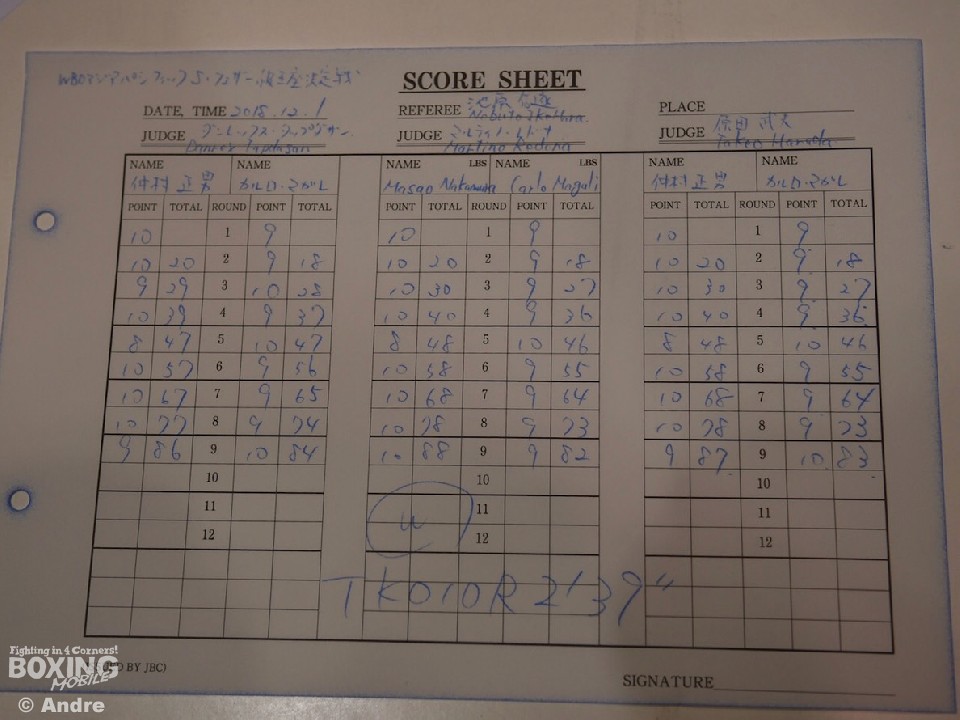 序盤は仲村が左を軸に丁寧に試合を組み立て的確にパンチを決めた。4回には右アッパーで動きを止めてペースを維持したが、5回にマガリの右フックを浴びダウンを喫した。それでも仲村は6回にワンツー、右アッパーを顔面、ボディに打ち込みジャッジに攻勢をアピール。被弾しながらも懸命にパンチを返すマガリに対し、キレのあるパンチで左目尻を切り裂いた。すると10回、仲村は右アッパーから連打で攻勢。傷が深くなったマガリを見てレフェリーが試合を止めた。