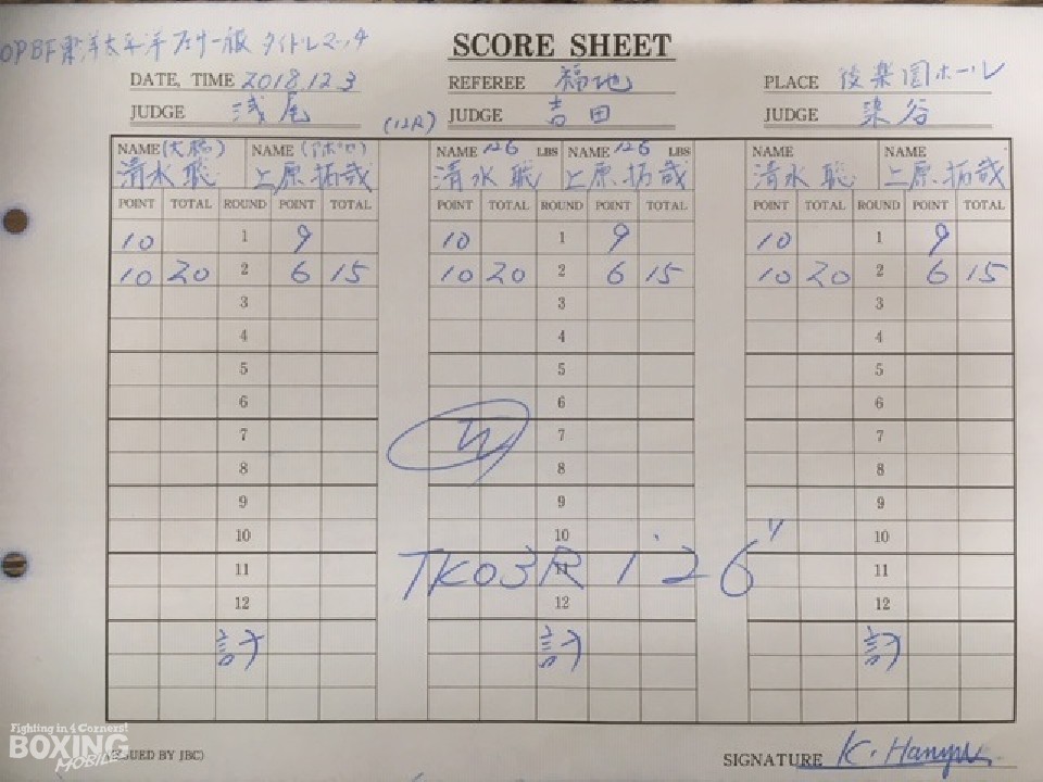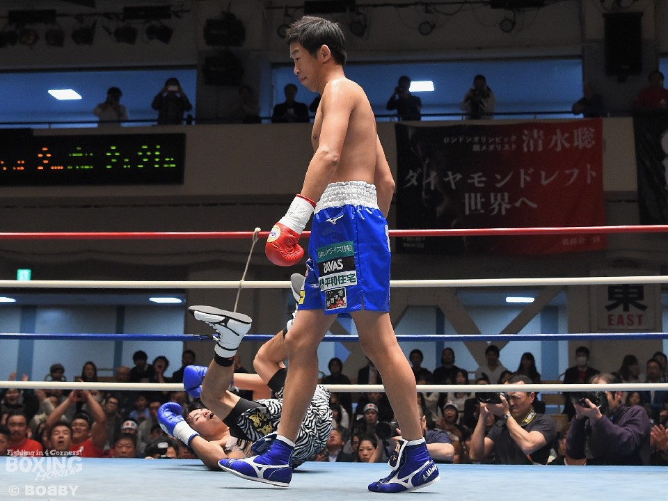 サスウポー同士の一戦は、清水がプレスをかけてサークリングする上原にジャブを突き先制。2回、清水は左ストレートを振り抜きダウンを奪うとさらに2度のダウンを追加し圧倒した。3回、清水は慌てることなくじっくり攻めると右フックから左ストレートを炸裂させて試合を終わらせた。