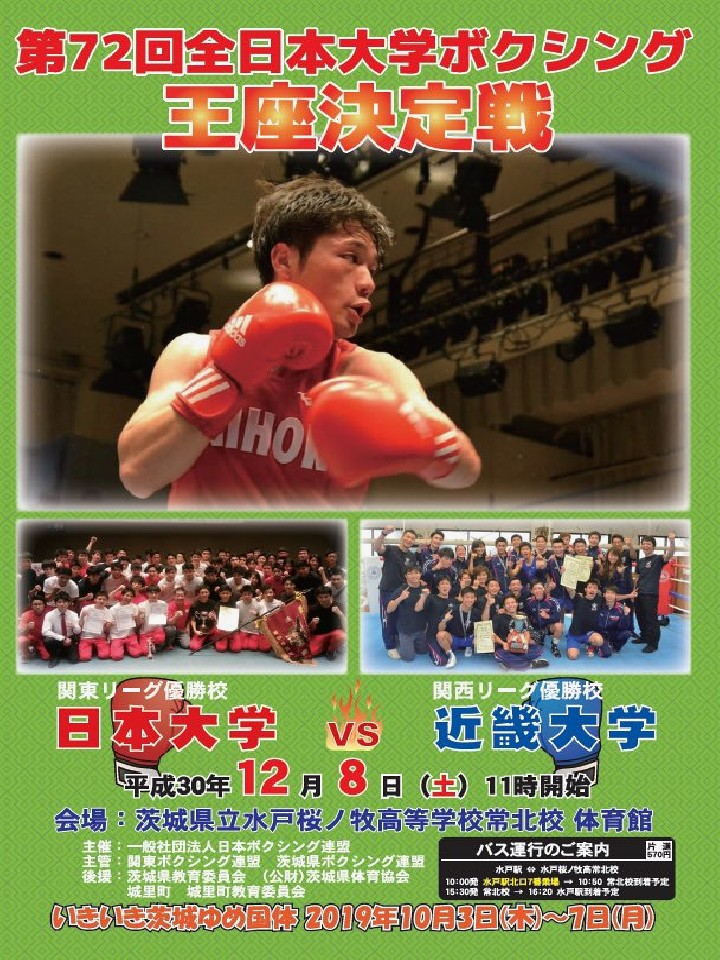 茨城県立水戸桜ノ牧高校・常北校では、8日、第72回全日本大学王座決定戦が行われ、今年度の関東大学リーグ優勝校・日本大学が関西学生リーグ優勝校・近畿大学を破り、5年連続、29回目の大学日本一に輝いた。大会の最優秀選手賞には鈴木稔弘(日大)、敢闘賞には荒本一成(日大)、技能賞には峯佑輔(近大)が選ばれている。