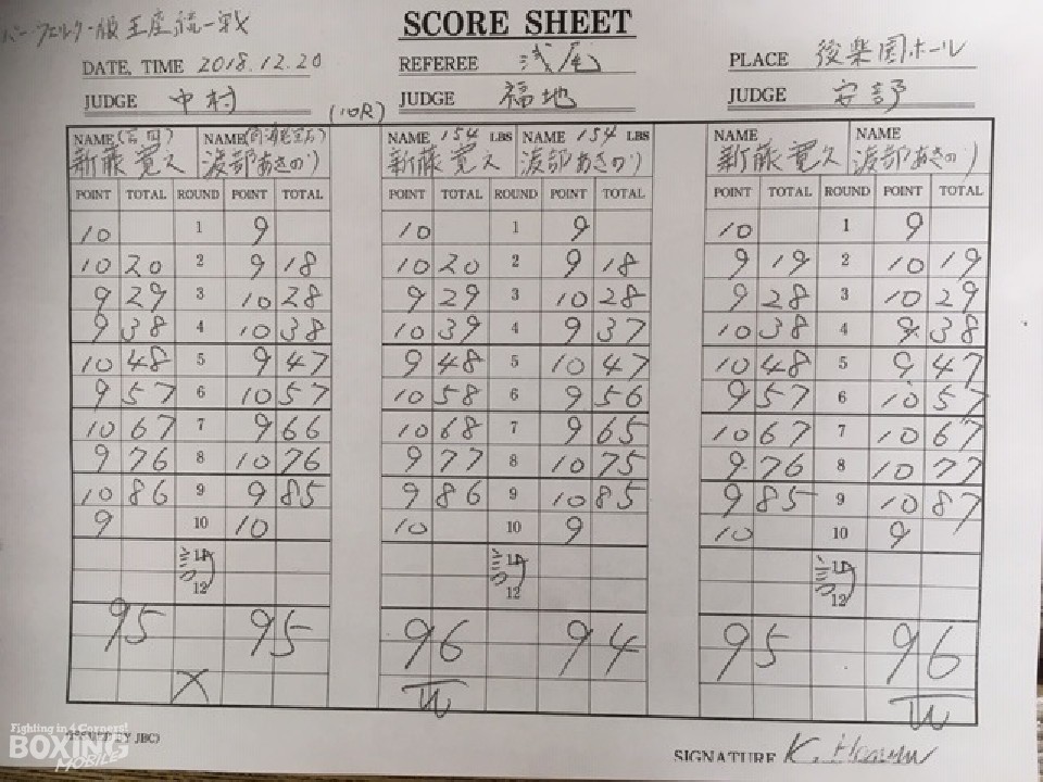 序盤は渡部が距離を潰してボディ攻撃で体力を削りにいくが、新藤は要所で左ストレートを決めて一進一退の攻防を繰り広げた。5回、プレスをかける渡部に対し、新藤はサークリングしながらパンチを外すと左ストレートを好打。前半終了時の公開採点は3者ともに48-47で新藤がリードした。6回、新藤は足を使いながら右アッパー、左ストレートで顔を弾くと、7回も左ストレートから返しの右フックを決めて優位に進める。劣勢を挽回したい渡部は、8回にジリジリと距離を詰めて左ボディを突き刺すとワンツーでぐらつかせた。9回も渡部が左フック、右アッパーをヒットし猛追。最終10回、勢いを増した渡部はしつこくボディを叩くが、新藤も左クロスで懸命に打ち返した。ジャッジに委ねられた採点は三者三様の引き分け。両者ともに防衛という形になった。来年のチャンピオンカーニバルの行方は、日本プロボクシング協会による協議の結果待ちとなった。