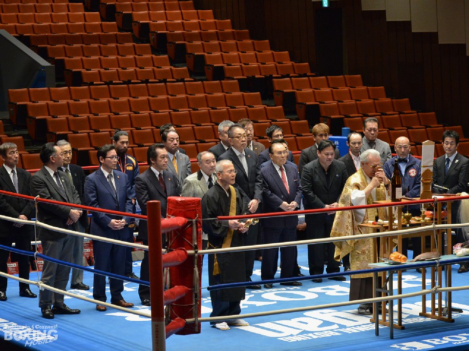 年明け最初のボクシングイベントが開催された12日の後楽園ホールでは、開場前にお清め式が執り行われた。リング上には日本プロボクシング協会、東日本ボクシング協会の渡辺均協会長をはじめとする各理事、日本ボクシングコミッション役員が並び、秘妙山・東京大黒殿の住職によりすべての選手、練習生、また関係者の安全と発展が祈願された。