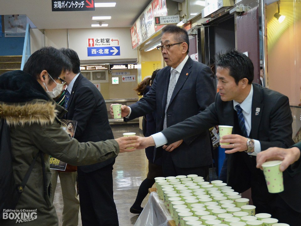 開場後には、渡辺協会長と新田渉世事務局長が後楽園ホールのエントランスで来場者を迎え、恒例のお神酒を振舞った。いよいよスタートした2019年のボクシング界。年号が変わる今年も選手たちの安全と活躍を願って止まない。