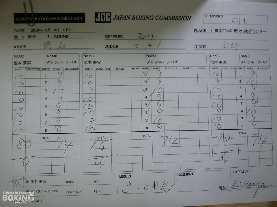 池本は試合後、「皆さんの協力で地元開催にこぎつけることができました。デパズ選手も強く、試合前はワクワク8割、怖さが2割だったが、リングに上がり声援を浴びたら怖さはなくなった。本当はKOで勝ちたかったが、明確な判定だったので次に繋がったと思う」と汗を拭いながら喜んだ。