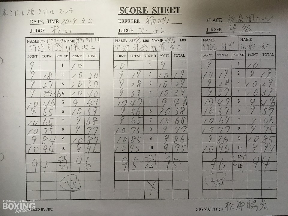 サウスポー加藤がジャブを飛ばしながらワンツー連打で積極的な攻撃を展開。対する竹迫はジリジリと距離を詰めてワンツー、左ボディを好打した。しかし、加藤は回転のある連打でタイトル奪取に闘志を燃やした。2回、竹迫は接近してショート連打で襲いかかるが、加藤は打ち終わりに左ストレートで顔を弾き対抗。4回、加藤は上下に打ち分けるとアッパーを突き上げ有効打を決めた。前半終了時の公開採点は48-47×2、49-46×1で加藤がリード。6回、竹迫は懸命に右を叩きつけるが、加藤はポジションを変えては左ストレートを決め見栄えの良さをアピールした。8回、竹迫はコーナーに詰めて細かいパンチを浴びせるが、大声援に後押しされた加藤は勝利への執念を見せた。10回、竹迫は手数を増やしてワンツー連打で攻勢。加藤もロープを背負いながら懸命に打ち返した。ジャッジに委ねられた採点は三者三様の引き分けで竹迫が王座を死守した。