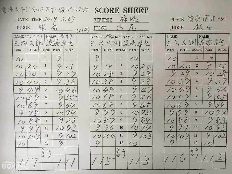 渡邉が左ボディを繰り出せば、三代は右から切り込み膝を揺らした。3回、渡邉はガードを上げながらジリジリ距離を縮めると左ボディ、さらには右フック、ロングの左アッパーを好打。4回は三代が右アッパーで顔を弾き明確にポイント奪った。4ラウンド終了時の公開採点は、38-38、39-37、40-36で三代がリード。流れを変えたい渡邉はプレスをかけて右から攻め立てるが、三代は左を軸に冷静な試合運びを展開した。6回、三代は右アッパーを効果的に決めると、ワンツーを叩き込み左目上を切り裂いた。守勢を強いられた渡邉だが8回に多彩な左で反撃。8回終了時は77-75×1、78-74×2でチャンピオンが差を広げた。後半は一歩も引かない打ち合いを見せたが、有効打で勝った三代がポイントを加点した。12回、逆転を狙う渡邉は懸命にパンチを繰り出したが、三代も譲らず2〜6ポイント差をつけて防衛を果たした。