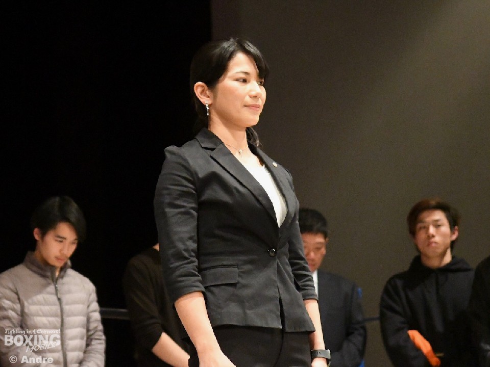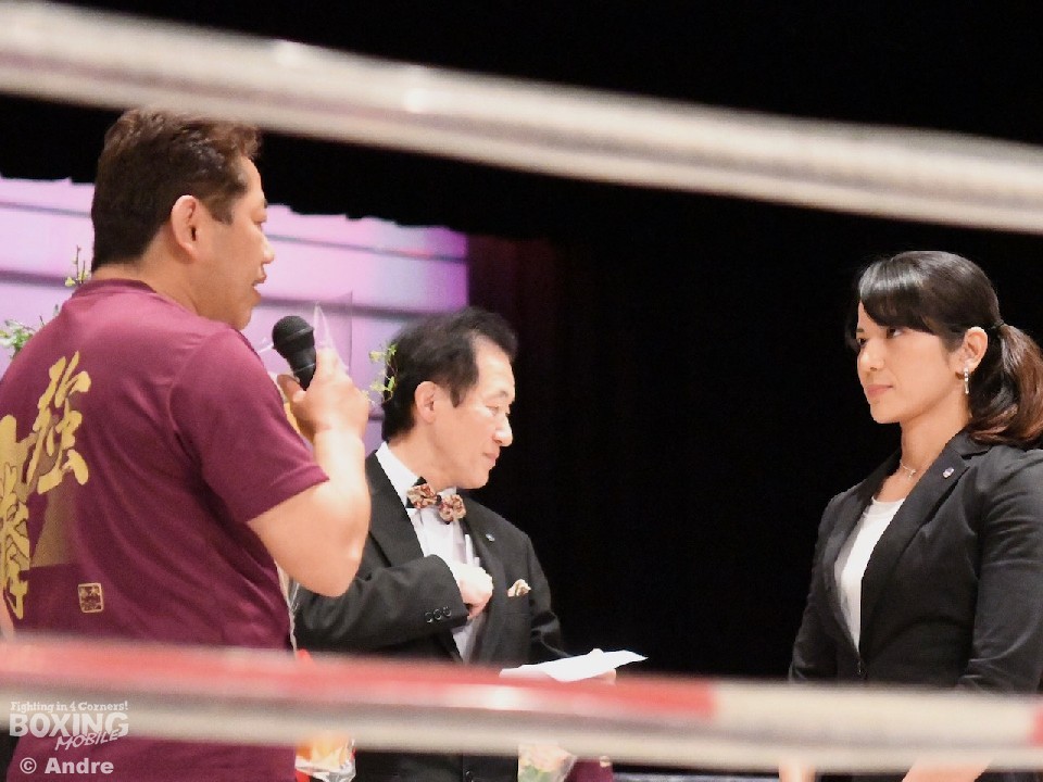登壇した好川は「引退式で選手として最後にリングに上がらせていただき関係者の皆様、本当にありがとうございます。アマチュアで14年、プロとして4年、100戦を超える試合をしてきました。そして最後の試合になったメキシコの試合で涙が出ず、引退することを決めました。今は堺市内でボクシングジムを作り女子ボクシングの普及に努めています」と語った。