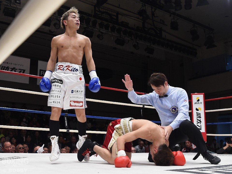 第3試合では日本ミニマム級8位の佐宗緋月(23=T&T)と芝力人(23=RK蒲田)が日本ユース・ライトフライ級準決勝で激突。芝が初回から鋭く踏み込んでは左フック、右ボディを好打し上々の滑り出しを見せると2回、左フックで効かせ連打から右フックでダウンを先取。さらに連打から左フックでフィニッシュした。
