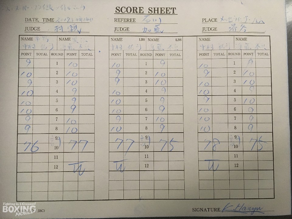 前半は挑戦者の近藤が、ジャブからワンツーを好打すると相手の返しのパンチも冷静に反応しペースを握った。中村は4回から圧力を強めて強烈な左ボディで見栄えの良さをアピールしポイントを挽回。近藤も足を止めて果敢に打ち合いに出て採点の難しいラウンドを重ねた。最終8回、近藤は鋭い左でポイントを奪いにいくが、中村が右フックでガクッと腰を沈めさせ譲らなかった。ジャッジ2者が中村を支持し初防衛に成功した。