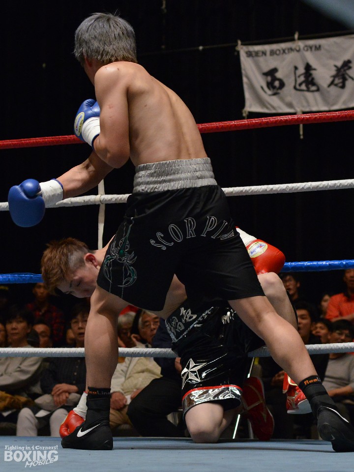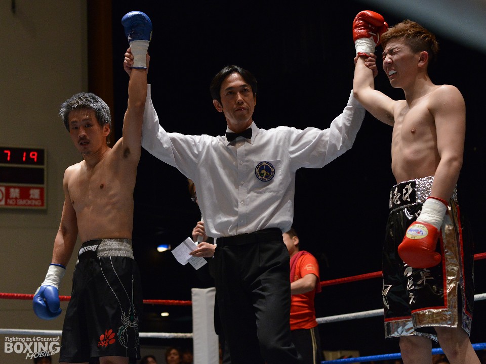 試合は右ジャブでリズムを計るサウスポーの河村に、佐伯が打ち終わりに右ストレートを合わせ対応したが、詰められると初回終了間際に右フックを浴びダウンを喫した。ここはゴングに救われた佐伯だが2回、巻き返しを図り前掛かりになったところで河村と頭が当たり右目上をカット。この傷が深く、ドクターチェック後にレフェリーが続行不能と判断し、負傷ドローとなった。