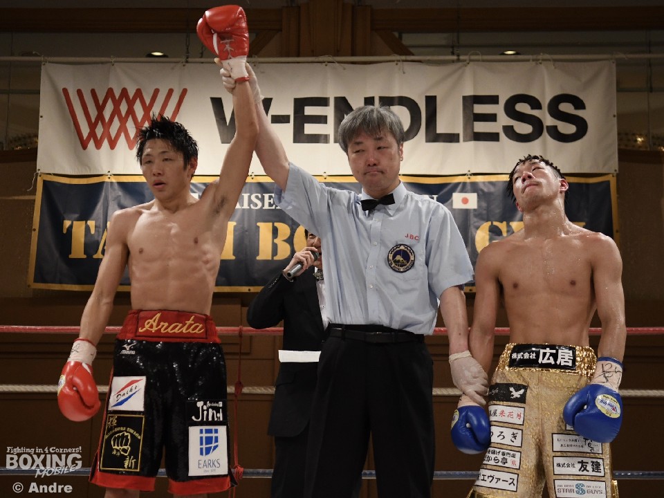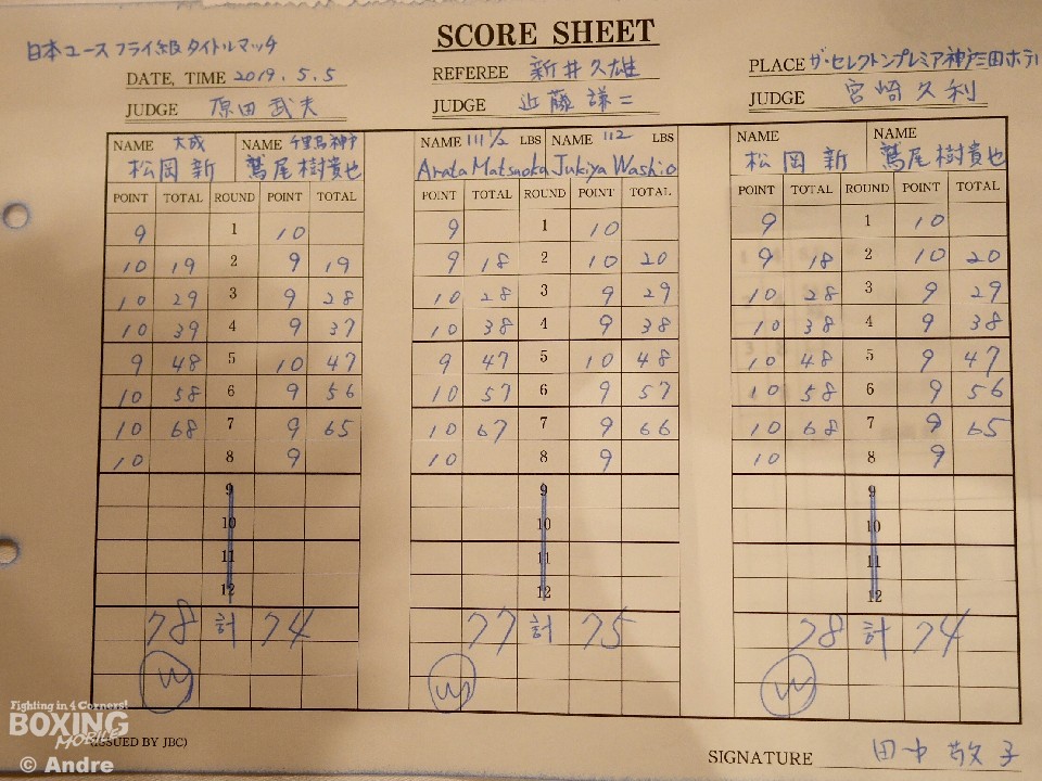 試合の前半は挑戦者の鷲尾にペースを握られた王者の松岡だが、徐々にエンジンの回転数を上げた。鷲尾は上体を細かく振り、右ストレートを伸ばすのに対して、序盤に固さを見せた松岡は鷲尾を捕まえることが出来ず。それでも中盤に入りプレスを強めると、踏み込む鷲尾にボディを決めペースを握り返し、最終ラウンドまでクリーンヒットを重ねポイントを挽回。判定は松岡が最大4ポイント差をつけ初防衛に成功した。