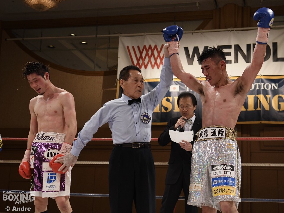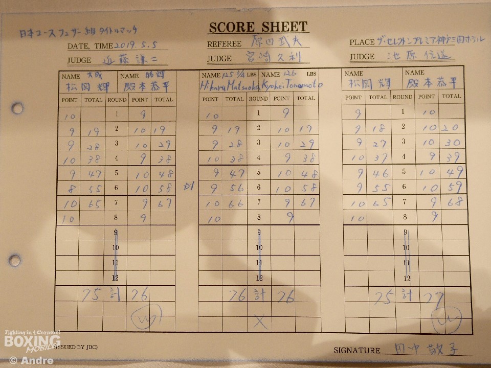 昨年12月に3年ぶりに復帰した殿本が、14年度新人王西軍代表の実力を発揮して序盤からジャブでペースを握った。ジャブを的確に当てる殿本に対して、踏み込んで右ストレートを伸ばす王者の松岡。距離を掌握した殿本だったが、中盤、松岡のボディに後退する場面を作る。すると6ラウンド、殿本の連打を浴びた松岡がダウンを喫する。ここは冷静に立ち直りを見せた松岡だったが、先制のジャブで試合をコントロールする殿本からペースを奪うことは出来ず。判定に持ち越された激戦の結果、判定2-0で新チャンピオンのコールとともに殿本の手が上がった。
