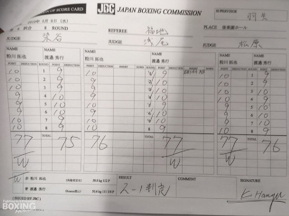 初回、粉川がサイドに動きながら右フックを好打すると、サウスポー渡邉は中間距離から左ストレート、右フックで対抗し打ち合いに持ち込んだ。しかし、中盤は距離が噛み合わずともに決定打が少ない展開。渡邉が先に仕掛け、粉川が打ち終わりを狙った。終盤に入ると激しいパンチの交換となったがここでも決め手に欠け、割れた採点は粉川がジャッジ2者の支持を得て勝利した。