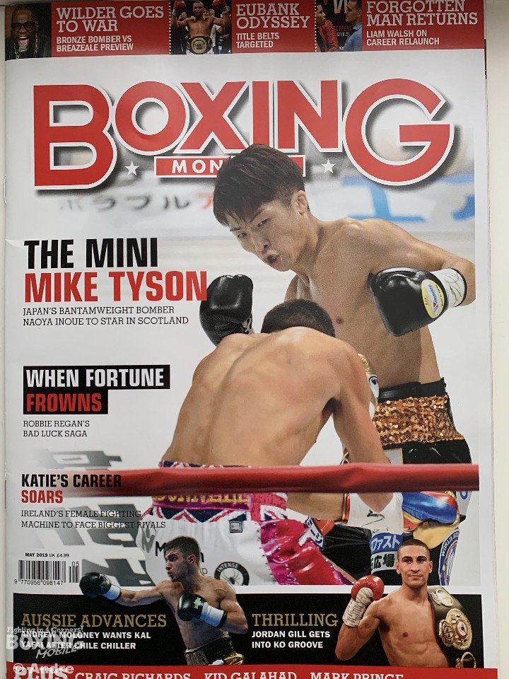 WBSS(ワールド・ボクシング・スーパー・シリーズ)で決勝進出を目指しイギリスのグラスゴーに降り立ったWBA世界バンタム級王者の井上尚弥(大橋)の注目度が増している。イギリスの権威あるボクシング雑誌、「BOXING MONTHLY」誌が5月号の表紙に井上を使い「ミニ・マイクタイソン」と称して4ページに渡り特集を組んでいる。