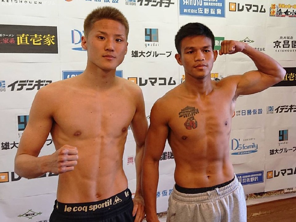 ここまで3戦全勝(3KO)の村地翼(22=駿河男児)は53.0kg契約8回戦でWBOアジアパシフィック・スーパーフライ級7位のレイモンド・タブゴン(28=比)と拳を交える。200gアンダーの52.8kgでクリアした村地は、「今年一発目の試合になるが飛躍の年にするので、明日はインパクトのあるKO勝ちで知名度を上げたい」とコメント。わずか4戦目でフィリピン人からランキングをもぎ取りに行く。一方、これが初来日のはタブゴンは600gアンダーの52.4kgで計量を終えた。