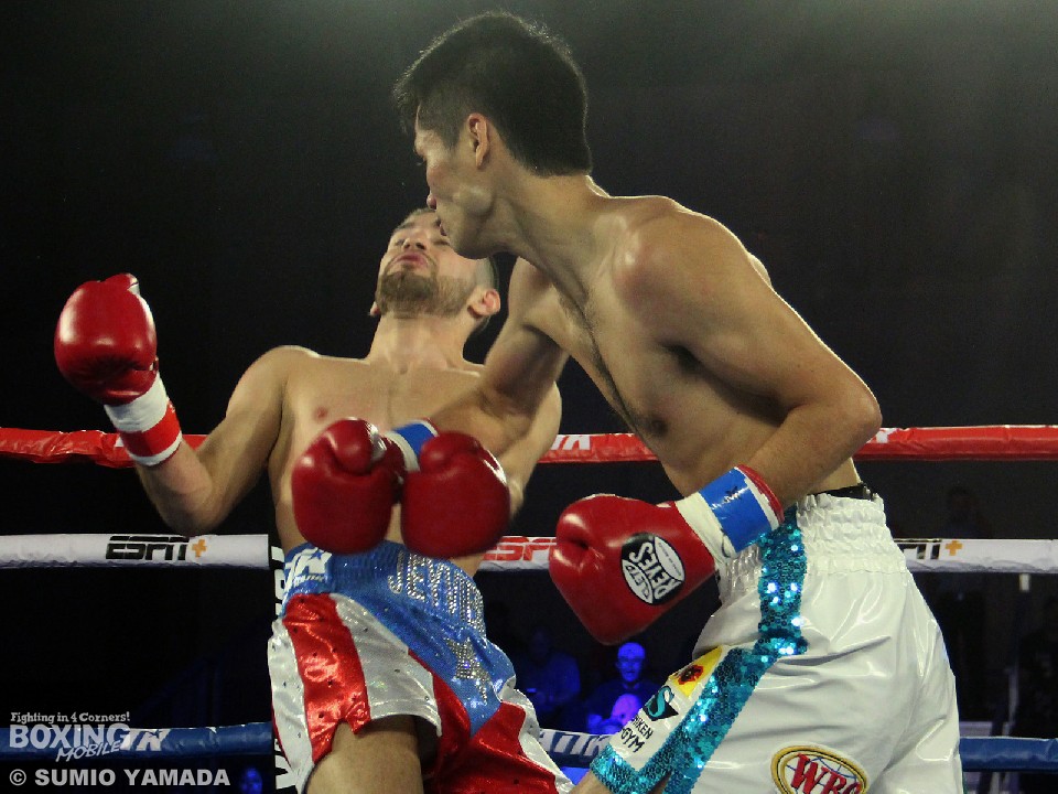 シントロンは12年と16年にフライ級で五輪に連続出場した元トップアマ。昨年7月にWBOユース・バンタム級王座を獲得し、ここまで10戦全勝(5KO)をマークするホープだけに初回から勢いよく仕掛けたが、2分過ぎにワンツーの打ち終わりに右ストレートを合わされ痛烈なダウン。すぐに立ち上がるが、体が完全に泳ぎ