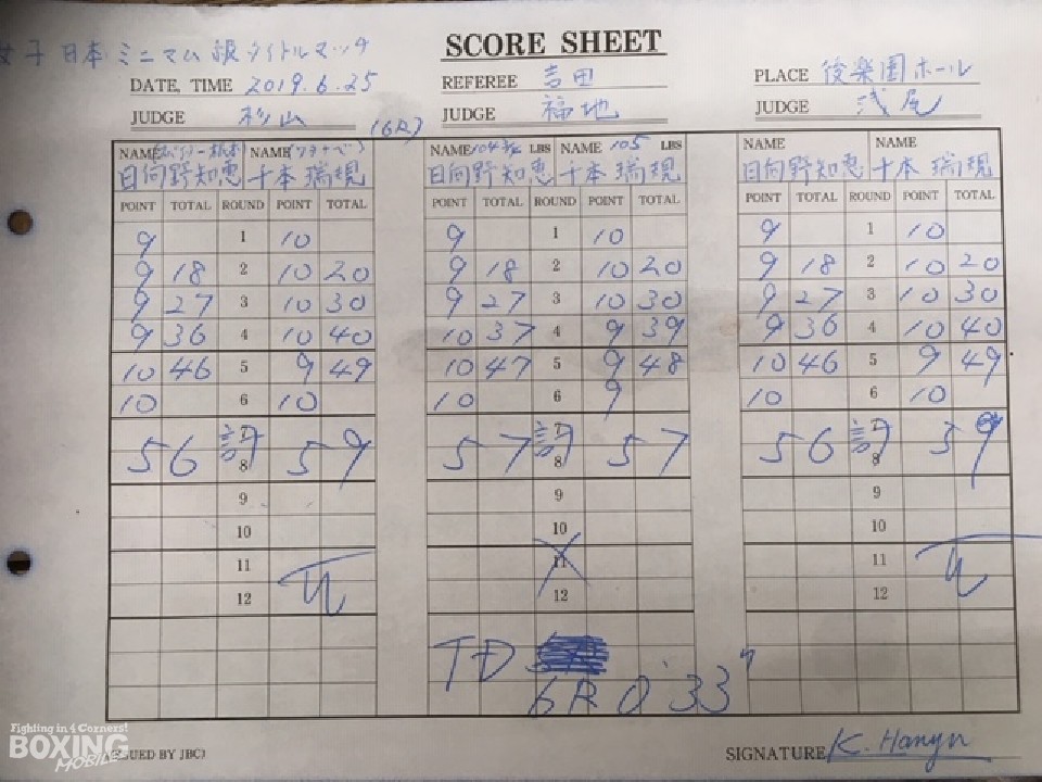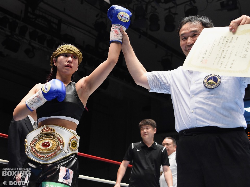 スピードで勝る千本がサークリングしながらジャブを飛ばし試合を作ると、前に出てくる日向野に右アッパーで迎え撃ち鼻血を流させた。流れを変えたい日向野は距離を詰めるが、千本は足を止めずに的確なパンチでポイントを加点。日向野も5回はワンツーを決めて膝を揺らすとパンチをまとめ反撃したが、6回に偶然のバッティングで千本が眉間をカット。傷が深く試合続行不能となった。負傷判定の結果、千本が日本&OPBF東洋太平洋アトム級王者の松田恵里(TEAM10COUNT)に並ぶ国内最速タイの2戦目で王座を獲得した。