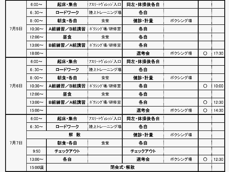 選考会・強化合宿の予定表