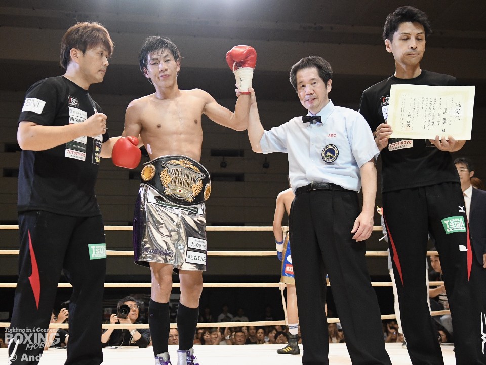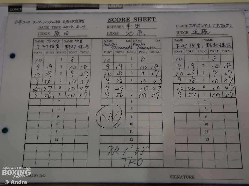 試合は、若手のホープ対決らしい打ち合いとなった。開始早々、下町の狙いすました左ストレートで野村がダウン。そこから立ち直りを見せた野村は接近して左右のボディを好打しペースを握ったが、下町も後手に回るが左ストレートを狙い続ける。すると7ラウンド、打ち合いのなかで下町の右フックが決まり野村が2度目のダウン。立ち上がった野村だが、再開後は防戦一方となり、ダメージが深いと見たレフェリーが割って入った。下町はTKO勝利で念願のベルトを腰に巻いた。