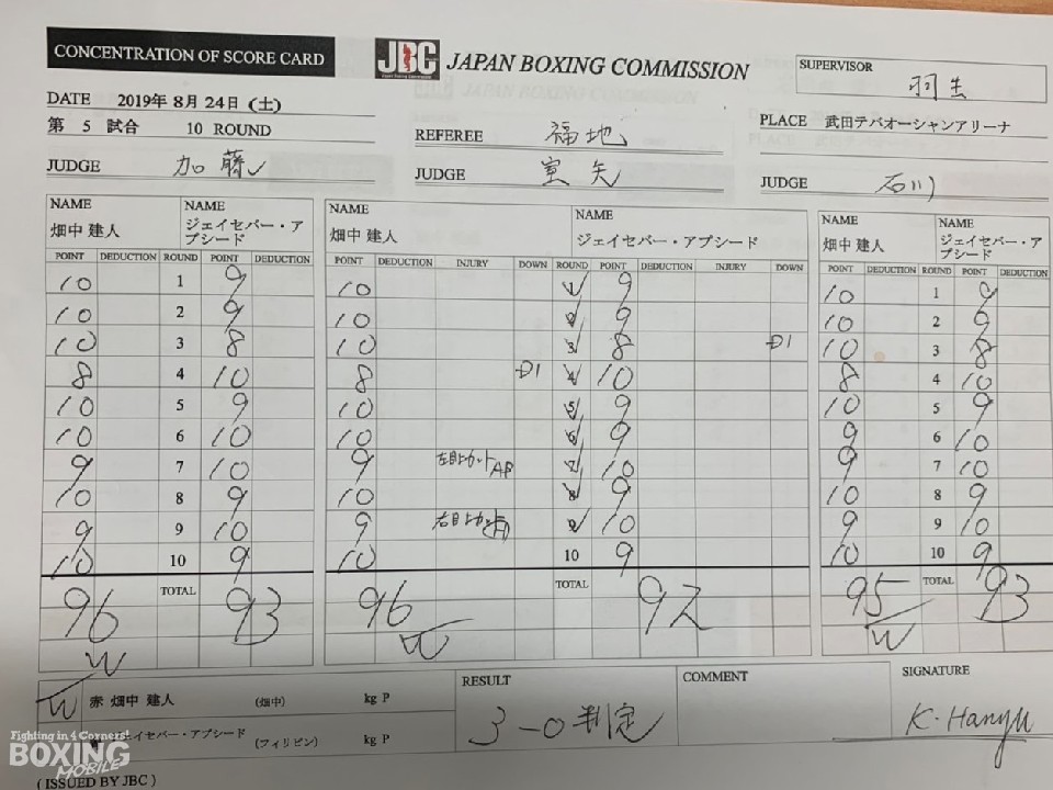 畑中はサウスポーのアブシードの強烈な左ストレートに対し、真っ向から応戦すると3回に連打でダウンを先取。しかし、世界ランカーの実力を発揮したアブシードは続く回に左アッパーから連打でダウンを奪い返した。その後は激しい打撃戦となるが、畑中が押し勝ち手数で攻勢。アブシードも負けん気の強さを見せて果敢に打ち合ったが、有効打で勝った畑中が快勝した。