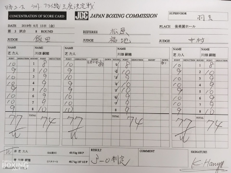 サウスポー川畑がサークリングしながらジャブから左ストレートをヒット。しかし、芝の右カウンターが炸裂し早くもダウンを奪った。ラウンド終盤、芝はヒッティングで左目上をカットした。2回、川畑は積極的な攻撃で相手の顔を弾き反撃。4回も川畑は上下に打ち分け、5回にはボディ攻撃が功を奏し攻勢。しかし6回、距離を詰めたところで芝の右アッパーがカウンターで入りガクッと腰を落とした。するとラスト2ラウンドは芝が力強いパンチでポイントを奪い、ジャッジ3者の支持を得て新チャンピオンに輝いた。